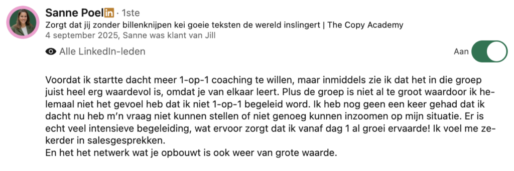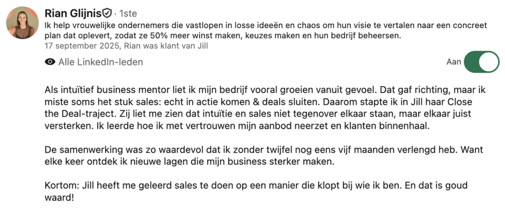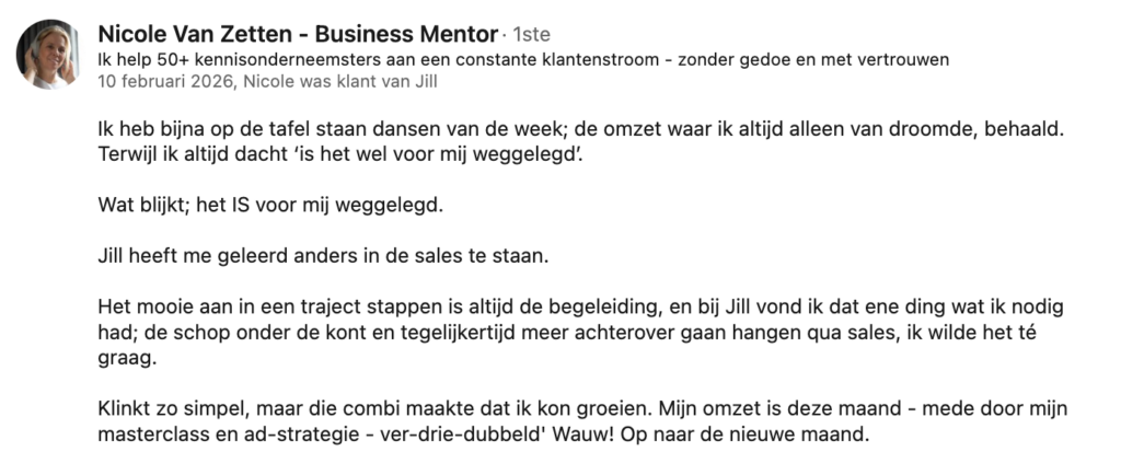 Kijk dat mijn focus ligt op het verbeteren van je salesgesprekken, betekent dit niet dat ik het genereren van leads oversla. Sterker nog: het één versterkt het ander. Zonder leads heb je natuurlijk geen gesprekken, maar wat je vaak ziet is dat het verbeteren van de kwaliteit van je gesprekken (dus zowel DM’s, je aanbod in story’s, posts) direct leidt tot meer leads. We zorgen er samen voor dat je niet alleen meer leads aantrekt, maar dat die leads ook echt waardevol zijn en makkelijker converteren naar klanten