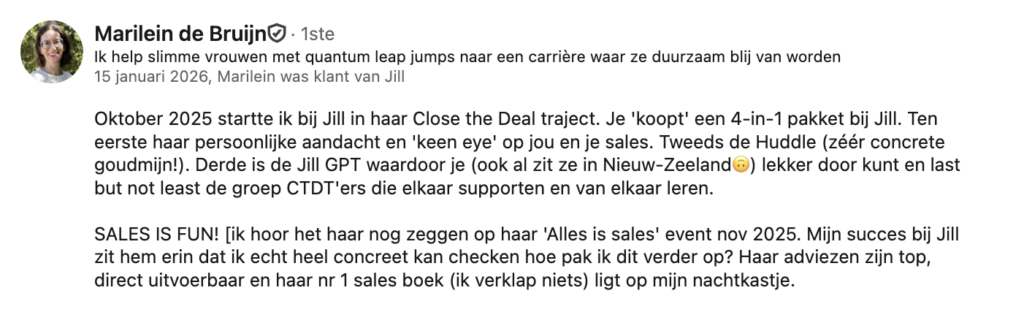 Heel goed. We kunnen namelijk niet allemaal hetzelfde zijn. Laat je niet afschrikken door wat je ziet, ik ben nu eenmaal een directe Hagenees met een zwak voor zwarte humor. Maar ik ga je niet een kopie van mij maken, ik ga je juist stimuleren je eigen draai hierin te vinden. Dat is vaak, wanneer het op verkopen aankomt, ook de kracht: jezelf zijn.